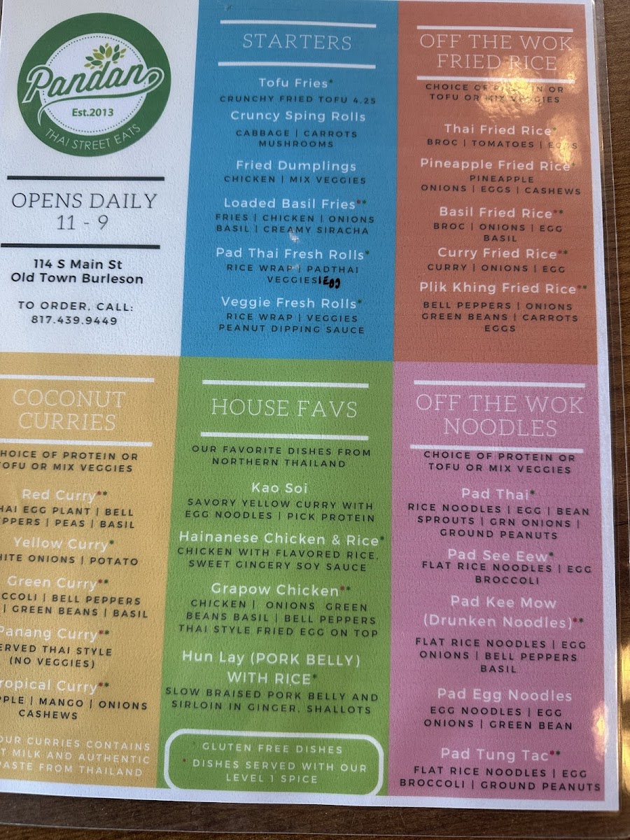 Located in the heart of Burleson, Pandan Thai Street Eats invites you to indulge in a vibrant array of authentic Thai flavors. The menu is a delightful blend of traditional street food classics and mouthwatering curries. Start with their Tom Yum Soup, a tantalizing hot and sour soup brimming with fresh ingredients or opt for the creamy indulgence of Tom Kha Soup.